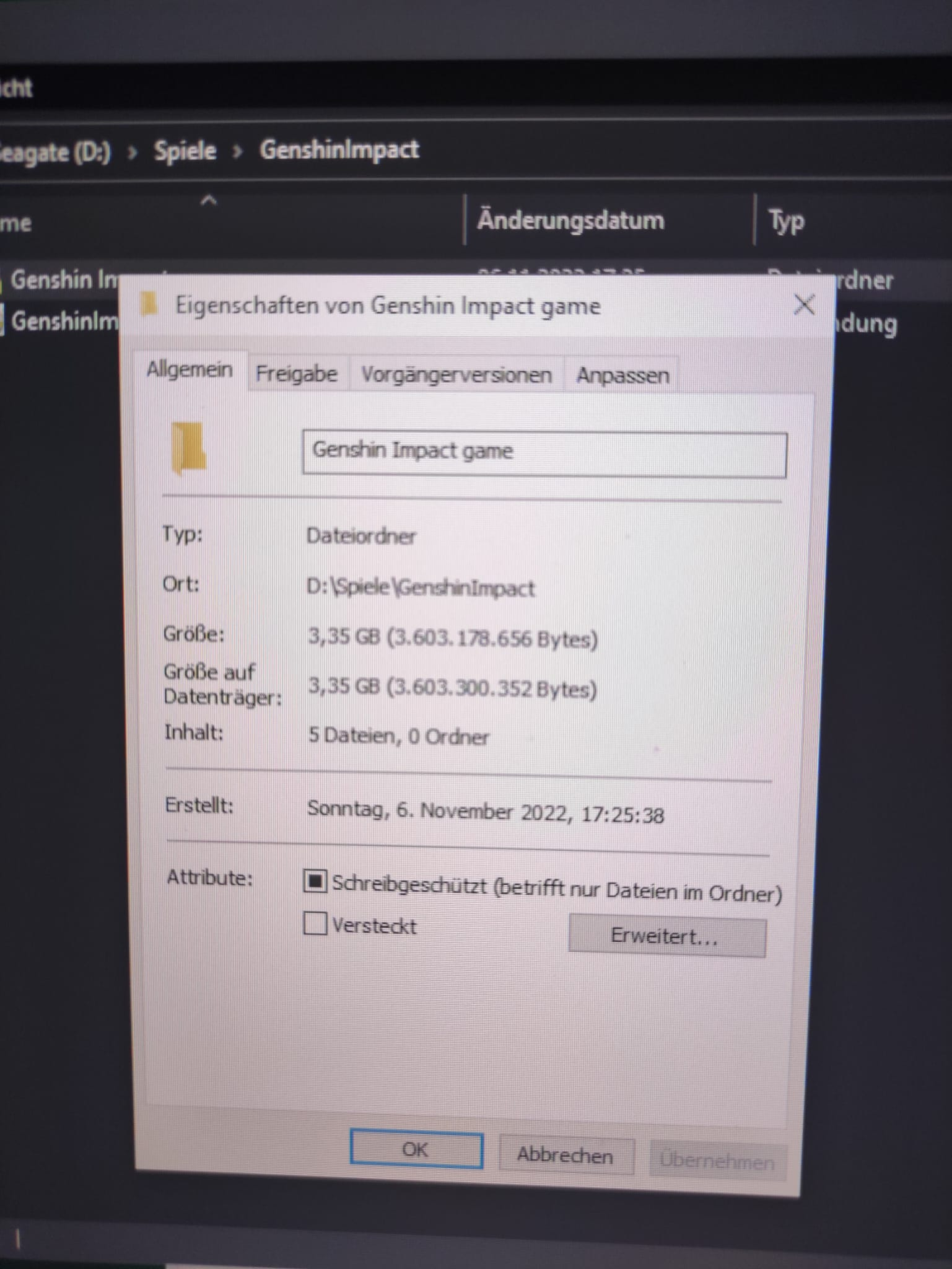 Hallo ich möchte mir Genshin Impact runterladen auf meine externe Festplatte, bin mir aber nicht sicher wo es am Ende ist. Wenn ich es mir runterlade speichere ich den Installer auf meiner externen Festplatte in einem Ordner. Wenn ich mir es dann runterlade und mir die Eigenschaften ansehe der App ( Foto1) sieht man das es in der internen Festplatte aber ausgeführt ist und gespeichert ist. Wenn ich dann in Genshin Impact gehe und mir schaue wo es installiert wird (Foto2) ist dort aber meine externe Festplatte. Und auch die ganzen Dateien sind in der internen (Foto3) wo ist es denn jetzt und was mache ich falsch.