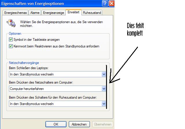 Hallo. Ich habe vor kurzem Windows XP neu installiert und nun habe ich eine Problem. Normalerweise drücke ich den Powerbutton und der Computer macht ein Shutdown und schaltet sich aus, oder wann ich in Windows ein Shutdown mache macht er den Shutdown und schaltet sich aus. Aber das geht nicht mehr. Wenn ich den Powerbutton drücke schaltet er sich sofort aus oder wann ich Shutdown mache macht er einen Shutdown schaltet sich aber nicht aus. Normalerweise ändert man dass in Systemsteuerung -> Energieoptionen. Dort kann ich im Tab Erweitert einstellen was er machen soll wann ich den Powerbutton drücke. Mein Problem ist diese Einstellungmöglichkeiten fehlen komplet. Ich kann im Tab Erweitert nur einstellen dass er dass Symbol in der Leiste anzeigt. Wie kann ich das ändern.