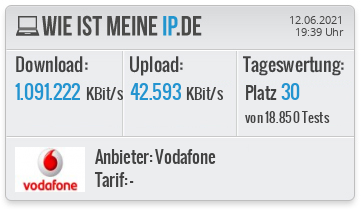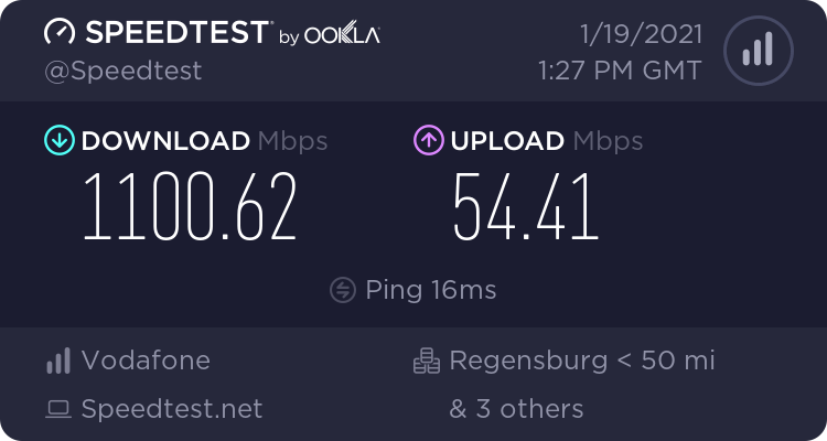 und das über WLAN, bin echt zufrieden mit dem Internet über Kabel, die Bandbreite schwankt bei mir gar nicht, also auch nicht zu Stoßzeiten oder am Wochenende, hatte auch tagsüber im Homeoffice nie Probleme.