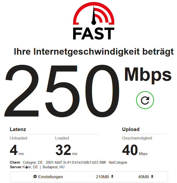Hier das Ergebnis meines Wechsels von 1&1 100Mbit/s zu NetCologne 250Mbit/s: