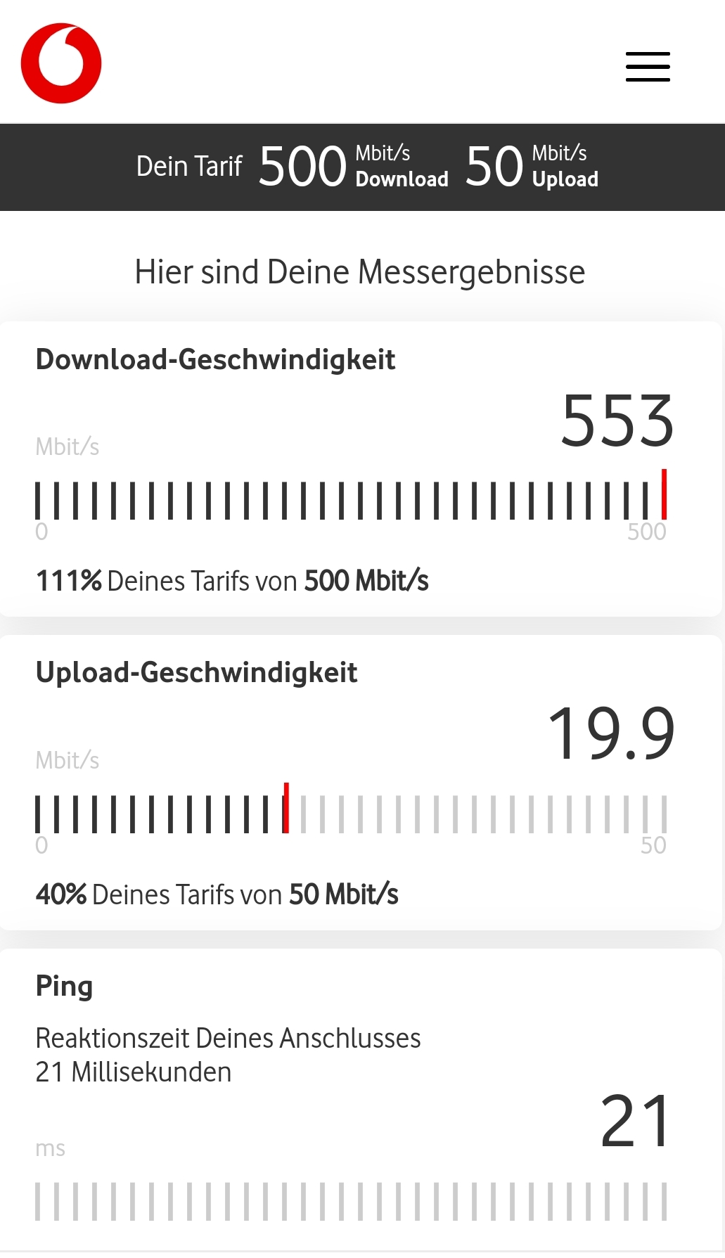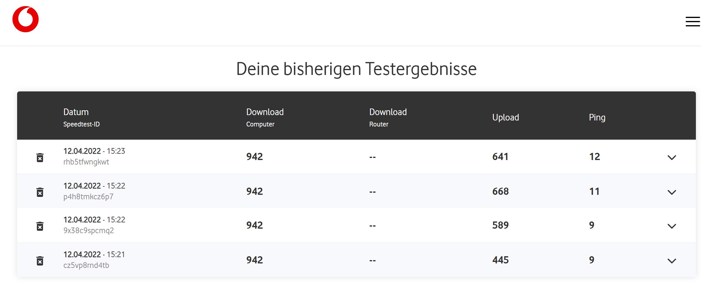 Oder aber mit der Desktop-App von breitbandmessung.de, da kann man davon ausgehen, dass VF ein Interesse daran hat gute nicht-ueberlastete Verbindungen zu haben, und der Test reserviert ausreichend Serverresourcen um eine Saettigung der Vertragsraten zu garantieren... als Bonus faellt, wenn man den ein ganze Messkampagne durchfuehrt auch noch belastbares Material an mit dem man bei VF und/oder BNetzA nochmal nachfragen kann...