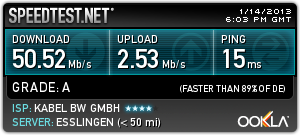 computerblicker schrieb:Bis jetzt schaff ich die 50MBit immer (zumindest bei Speedtests), arg viel weniger UL dürfts aber nich sein :/