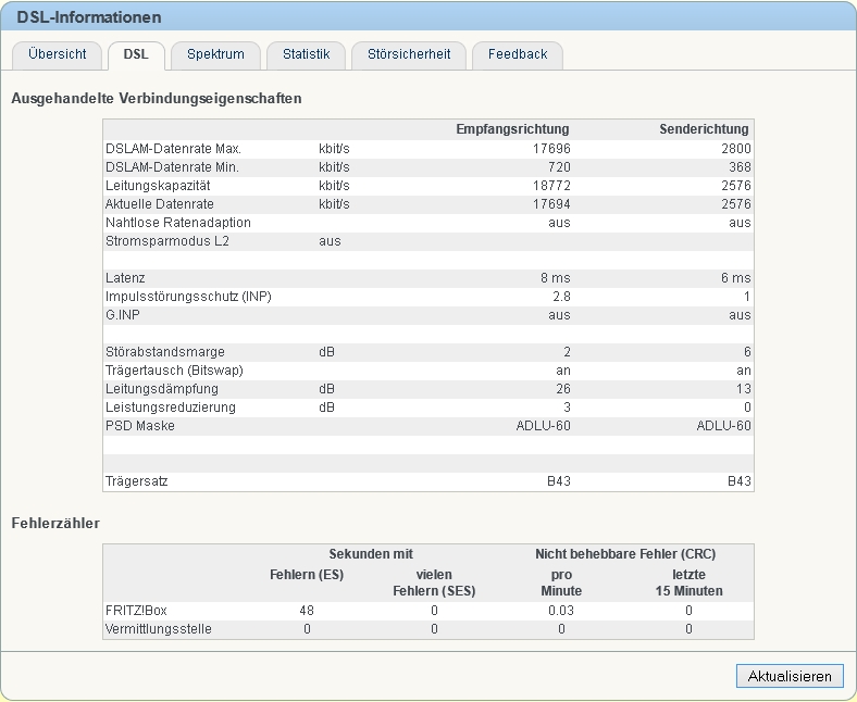 Hab DSL 16k, Sync liegt bei 17694 kbit/s, und trotzdem im Speedtest nur 15 Mbit. Theoretisch kann ich da ja gar nicht die vollen 16k nutzen, die schaffe ich ja nichtmal mit Sync am Anschlag des Profils, es verpuffen quasi 2,5k. Oo
