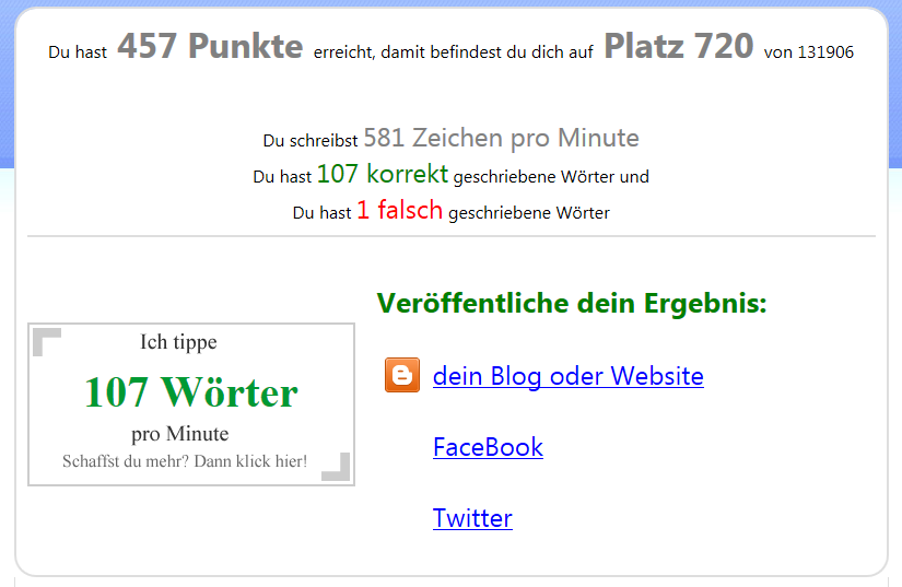 Ich hatte 73 Wörter mit 429 Anschlägen pro Minute. Jedoch ist dieser Test natürlich auch etwas Textabhängig. Schließlich erreiche ich auch manchmal auch über 80