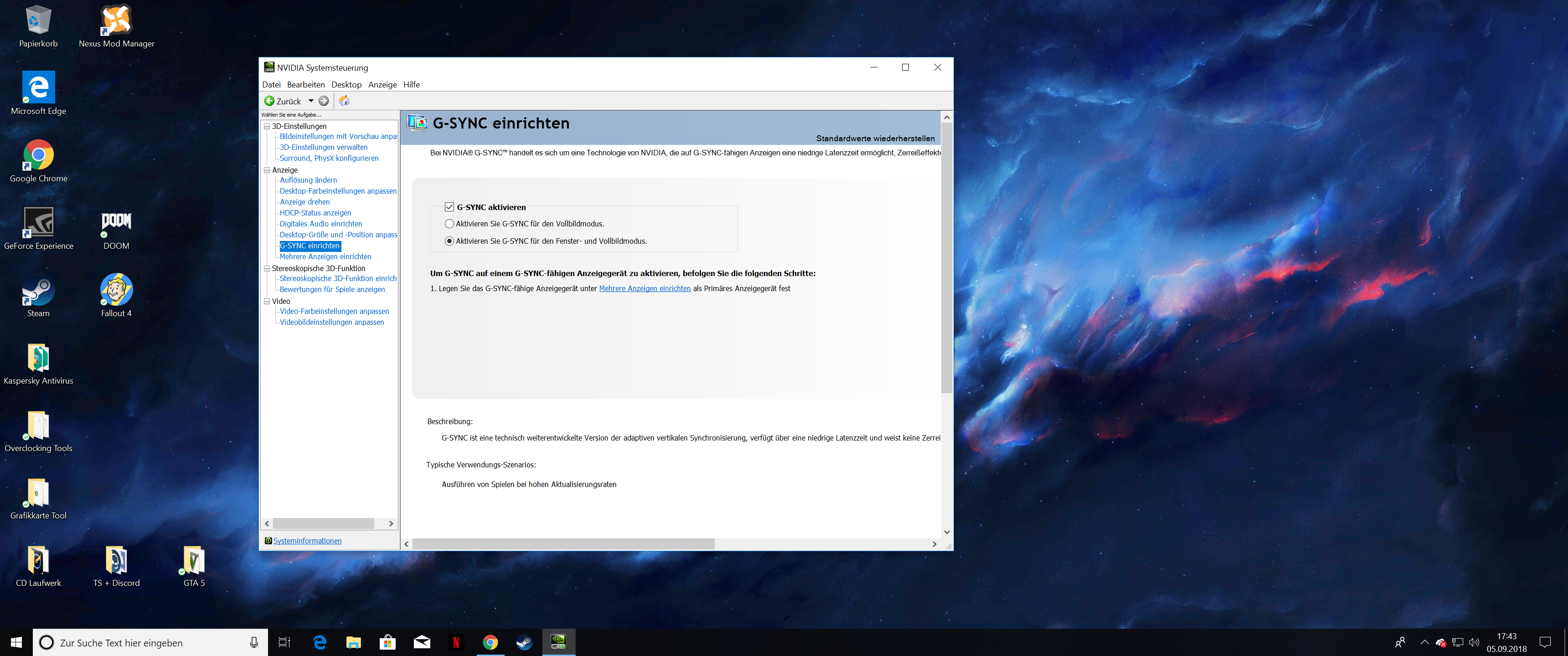 nach meinem neuen PC habe ich mir nun auch einen neuen Monitor geholt. Der Alienware AW3418DW mit Gsync und 120Hz. Ich bin vollkommen zufrieden damit, jedoch habe ich null Erfahrung mit Gsync. Dies ist mein erster Gsync Monitor. Ich habe Videos geschaut, doch sie haben mir nicht so richtig geholfen.. ich habe in der Nvidia Systemsteuerung Gsync aktiviert für Fenster und Vollbild und in den 3D Einstellungen 120FPS gelockt(Vertikale Synchronisierung). Alles läuft stabil, jedoch kriege ich in gewissen Spielen wie zB Fallout 4 FPS Drops und die machen sich deutlich bemerkbar. Ich habe eine GTX 1080TI und Ryzen 5 2600 4Ghz übertaktet. Viele sagen, dass Fallout 4 eine schlechte Optimierung hat und es nicht an der Grafikkarte liegt, dass man bei gewissen Ultra Settings FPS Drops bekommt. Ich finde es etwas störend, da man ruckler bemerkt. Es schwankt zwar 'nur' zwischen 120-80FPS, jedoch macht sich dieser FPS Drop bemerkbar. Ist etwas an Gsync falsch eingestellt worden? Oder ist dies normal. Kann man statt 120FPS zB nur 80FPS mit Gsync einstellen, da ich dadurch keine Ruckler mehr bekommen würde.