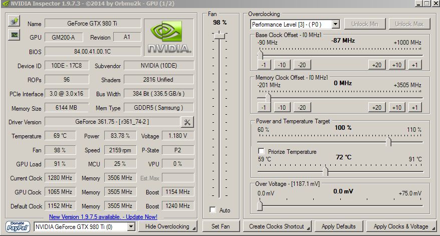 In der damals und in den Folgewochen noch etwas kühleren Temperaturen konnte ich die Karten mit dem NVIDIA-Inspector relativ gut bis auf ca. 1420 MHz übertakten, ohne daß sowohl die GPU-Temperaturen als auch die Raumtemperatur ein Problem war.