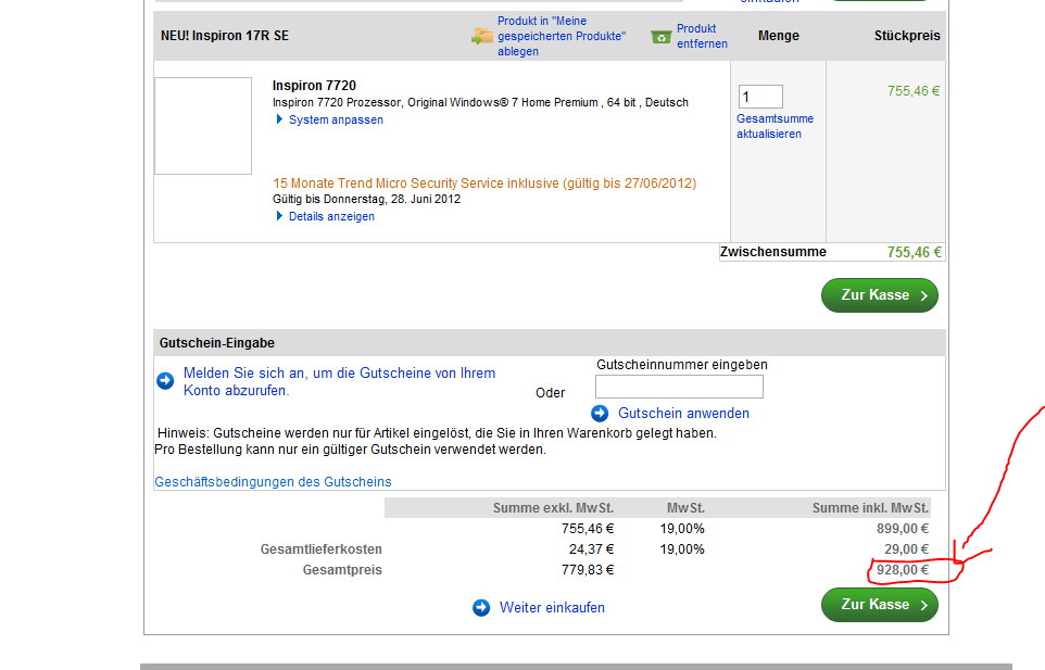 Ich hab gerade geguckt wie teuer das ist wenn ich es in den Warenkorb lege und siehe da vorher hat es 755 gekostet bei dell und jetzt steht da es kommen noch die Mwst. drauf also insgesammt 928€ mit versand . für 755 würde ich es kaufen aber für 958€ ???