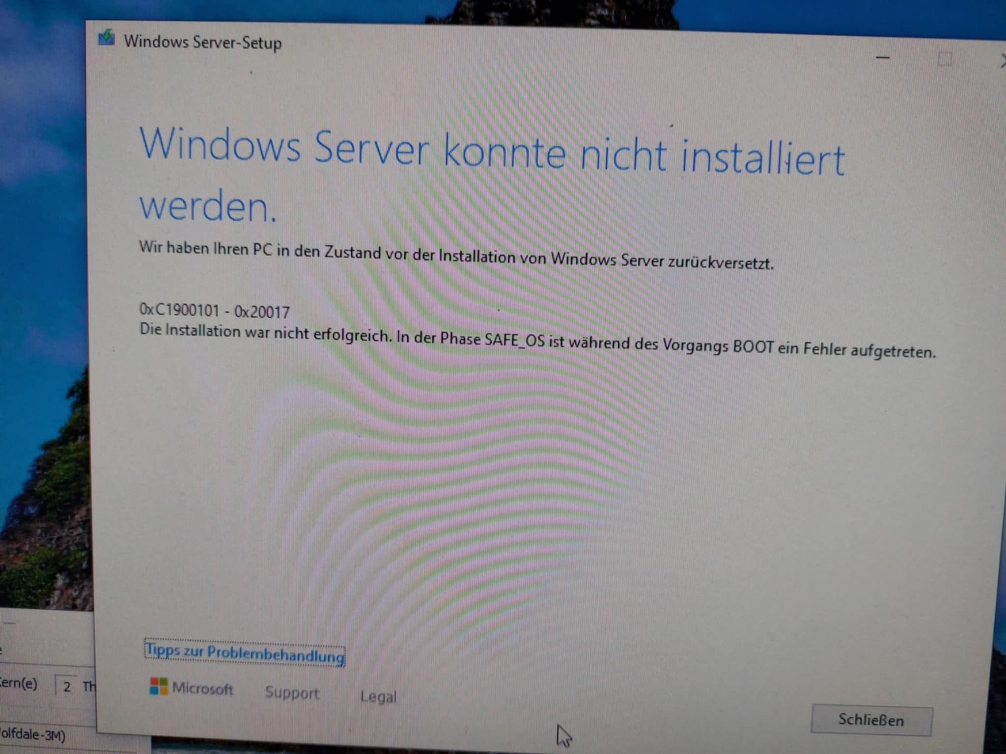 Nach der ersten Phase kommt die im Screenshot gezeigte Meldung "Windows Server konnte nicht installiert werden", samt einer genauen Fehlermeldung.