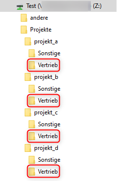 Was möchte ich? Ich will das der User nur auf die Ordner Vertrieb den (RW) zugriff hat. Wie löse ich das nun das ich ihm den Ordner "Test" freigebe und er dann aber darin nur "Projekte" sieht dort wiederum alle Ordner "projekt_a-d" und in diesen Ordnern dann nur den "Vertrieb" Ordner sehen/drin arbeiten kann aber den "Sonstige" Ordner nicht. Also so: Test -> Projekte -> Projekt_a -> Vertrieb das ist das einzige was er sehen darf. Alles andere ausser die "Vertrieb" Ordner und "die Ordner auf dem weg dahin" darf er nicht sehen.