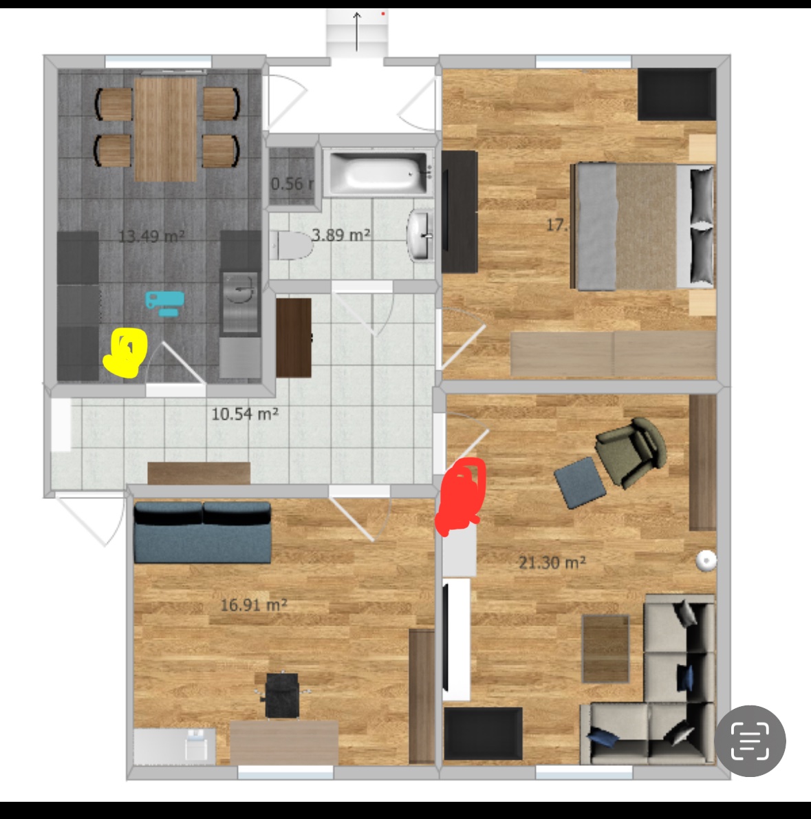 Im Grundriss ist die Position von Router Rot markiert von Repeater gelb.