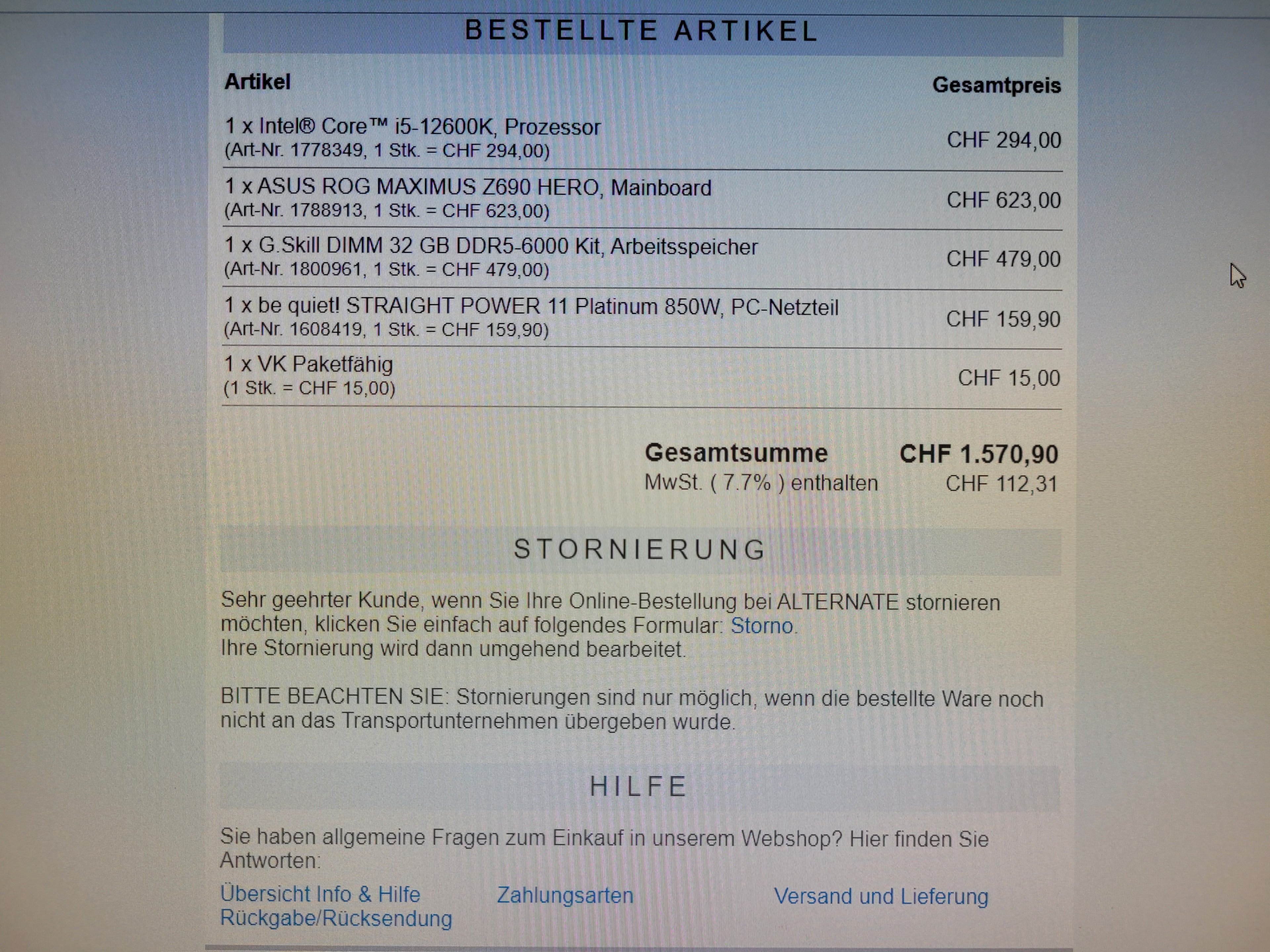 Beim Netzteil habe ich mir nicht so viele Gedanken gemacht, weil ich dachte, ich hab schon ein Gehäuse von be quiet (Dark Base Pro 900 rev.2) und dann kaufe ich mir gleich das NT von denen (STRAIGHT POWER 11 Platinum 850W) Ist das wirklich soo schlecht? Ich spiele mit dem Gedanken, die Bestellung zu stornieren, da ich die Überweisung noch nicht getätigt habe und anstatt des ASUS Z690 Prime MB's, das ASUS Strix Z690-F für 420€ oder das MAXIMUS HERO für 550€ zu holen oder wäre das auch nur Geldverschwendung? Ich will mir auch nen neuen Monitor holen! Entweder den ASUS ROG PG32UQ oder den ASUS ROG XG27UQR! Was hällst du von den Monitoren?cyberpirate schrieb:Auch das bequiet NT finde Ich nicht gut. Ein Seasonic mit doppelt so langer Garantie und wesentlich leiser wäre doch besser gewesen. Und beim RAM hätte DDR4 völlig gereicht.ö Vor allem da DDR 5 auf Z690 beim zocken NULL Vorteile bringt. Dann besser in 2 Jahren Mainboard und RAM mit der neuen CPU getauscht! Für die jetzt gesparten 400€. Vor allem der RAM wird in 2 Jahren dann auch lahm sein gegenüber dem was dann kommt. Aber jeder wie er mag.