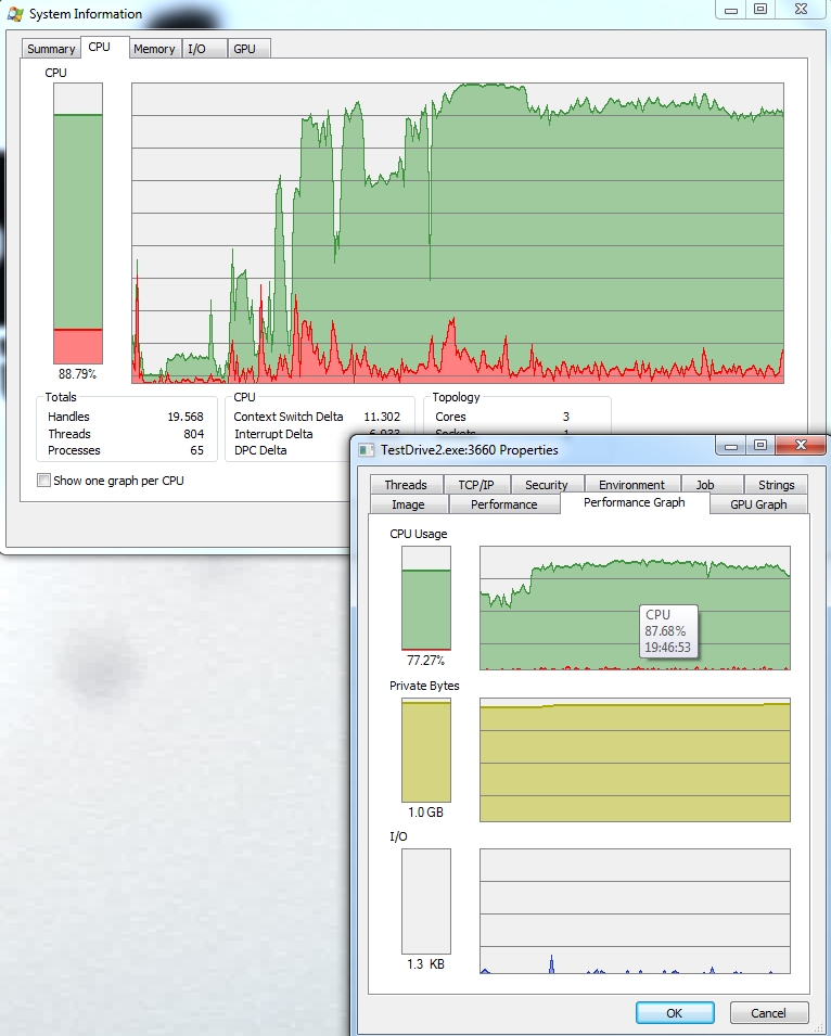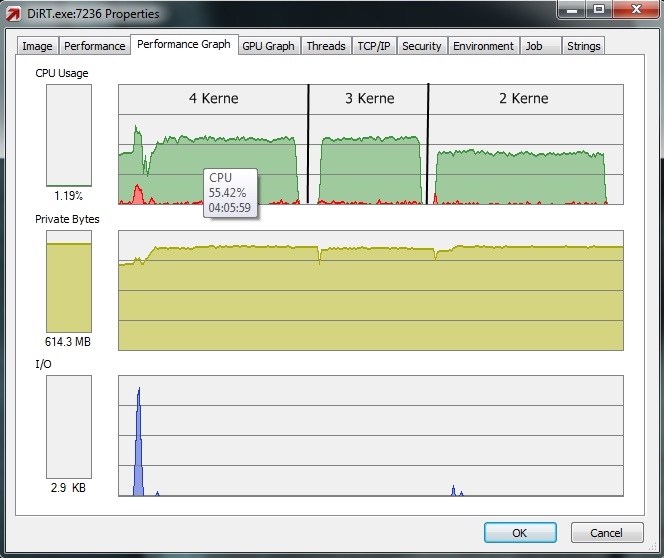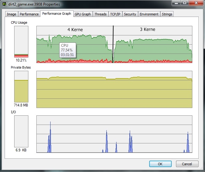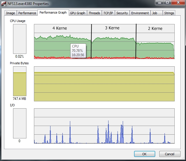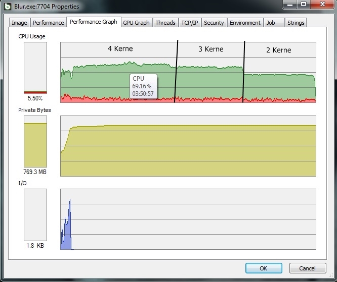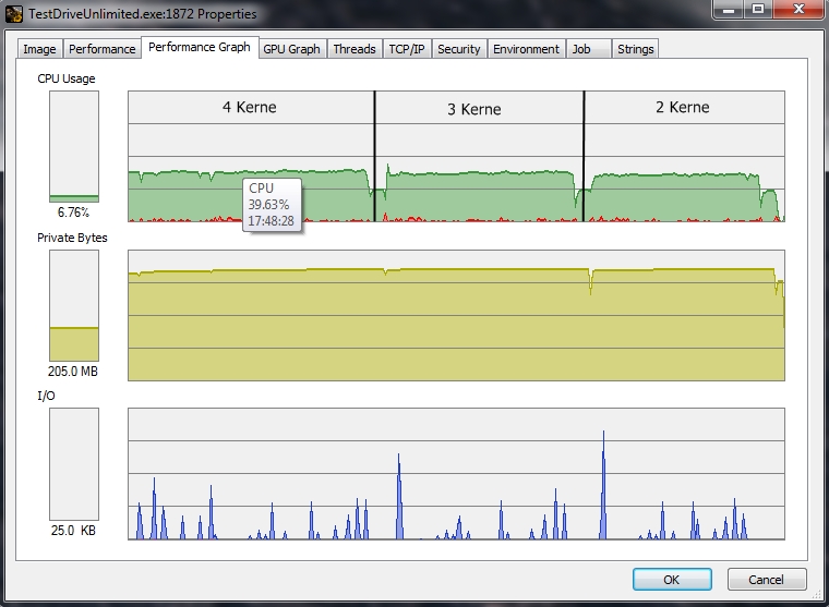 Da man bei TDU2 im Task-Manager die Anzahl der Kern nicht Ändern kann, hab ich für den zweiten Screenshot die Anzahl der Kerne auf 3 gestellt und damit man sieht das die CPU nicht am Anschlag ist. Also würde ich sagen 4 Kerne.