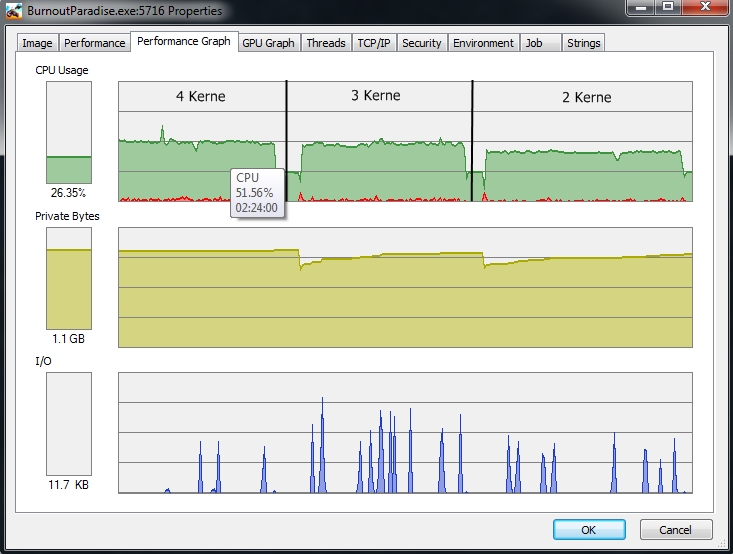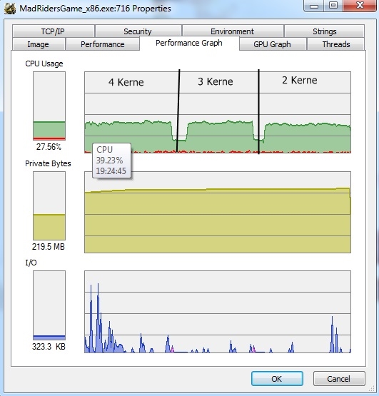 Hab mit jetzt mal die meisten der derzeit installierten Spiele angeschaut. Hab immer mit Hilfe des Task-Managers die Anzahl der Kerne veränder (hab das auch grob eingezeichnet), weshalb die "Verluste" bei einem echten 2 oder 3 Kerner tendenziell höher sein werden, da sich die Hintergrundlast nicht so gut verteilen kann. Alle Spiele wurden mit höchsten Grafikeinstellungen getestet. Als CPU kam ein i5 2500k @ 1,6 GHz zum Einsatz.