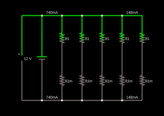 Die 0.74 A sind die theoretische Obergrenze für den Anlaufstrom mit fünf parallel geschalteten 81 Ohm Vorwiderständen. Die 0.038 A fließen pro Lüfter mit Vorwiderstand, wenn die maximale Drehzahl bereits erreicht ist. Bei fünf Lüftern wären es dann eben 0.038 A * 5 = 0.19 A < 0.74 A.