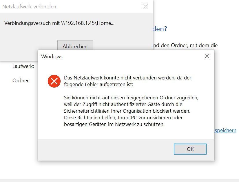 Wie oft hat man hier nach den Rechten gefragt, welche Firewall bzw welches Tool blockiert den Zugriff, Kaspersky oder sowas? Lese Dir doch Mal die Fehlermeldung genauer durch, Versuche Mal die Verbindung als anderer Benutzer und gebe den Benutzer mit den Rechten an, dem Du die Freigabe auf dem NAS erstellt hast. Es ist ja wohl nicht im Gastnetz vom Router, den wir ja auch noch nicht kennen.
