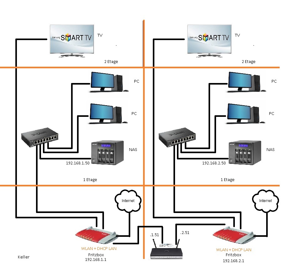 Allerdings würde es dann schon Sinn machen die Fritzboxen raus zu schmeißen und die beiden neuen Router alles machen zu lassen.