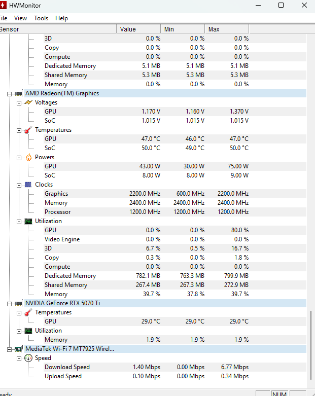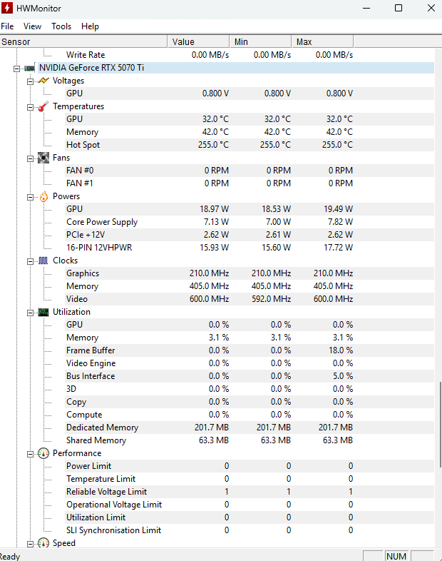 In HWInfo 64 wird die 5070 Ti btw gar nicht mehr angezeigt, wenn es zum Lüfter-Maxxing kommt. Davor schon. HWMonitor hingegen zeigt zumindest die Temperatur noch an, aber keine Details mehr, siehe Vergleichs-Screenshots im Anhang dieses Postings.