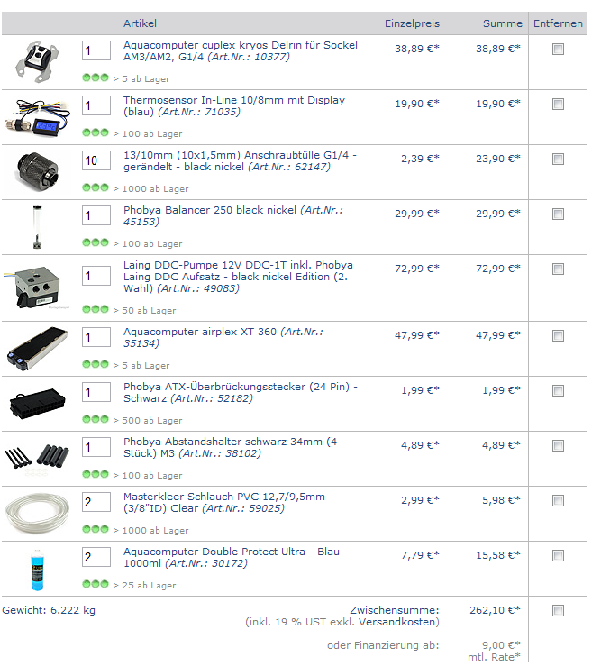 Zuerst wird nur alles für die CPU gekauft und dann nach meinem Geburtstag kommt noch die Motherboard kühler dazu und dann wenn ich wieder Geld habe eine neue Grafikkarte die dann auch mit Wasser gekühlt wird.