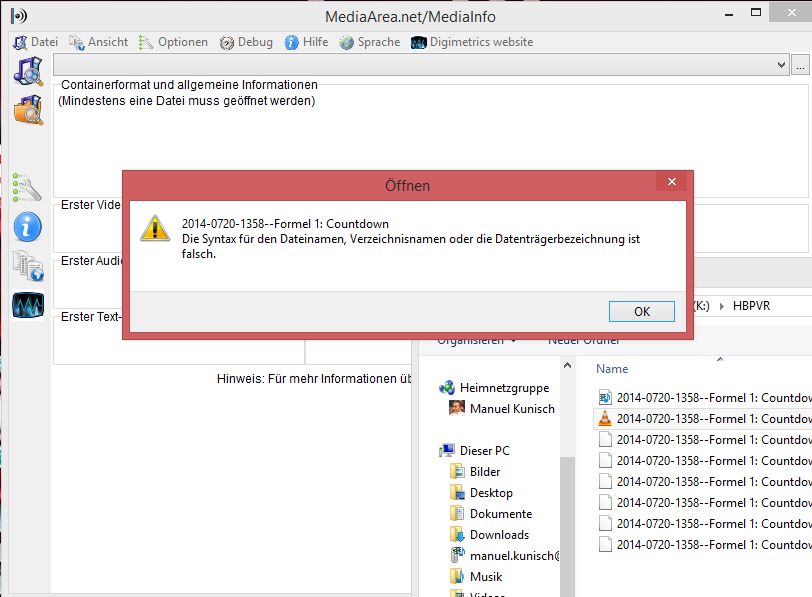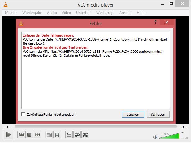 VLC konnte die Datei "K:\HBPVR\2014-0720-1358--Formel 1: Countdown.mts1" nicht öffnen (Bad file descriptor).