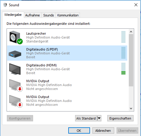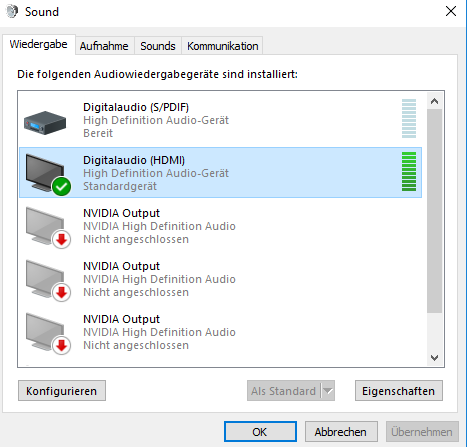 Danach habe ich aber den PC neugestartet, mein Headset angeschlossen (vorne am PC), meinen Bildschirm getestet im Sound-Fenster, anschließend den Lautsprecher als Standardwiedergabegerät eingestellt und plötzlich läuft der Sound wieder.