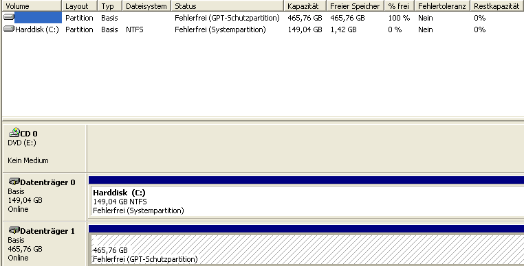 Die Datenträgerverwaltung von XP zeigt [leer] als Dateisystem an und als Status: fehlerfrei (GPT-Schutzpartition).