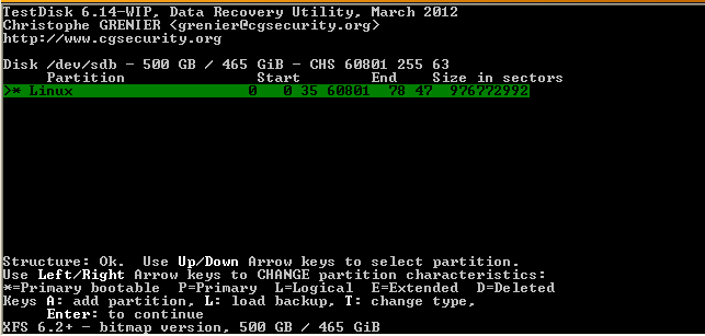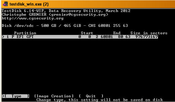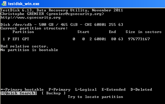 Habe mit Testdisk v6.14 eine Analyse gemacht. Es wird eine Partition angezeigt „1 P EFI GPT …(drive Parameter) … Bad relative sector. No partition bootable“. Bei der Wahl des Partitionstabellen-Typs wurde automatisch <EFI GPT> erkannt. Habe dann aber die Analyse unter <INTEL> gemacht. Sowohl im Quick search als auch im Deep search Modus wurde nur die Linux Partition (und keine unter Windows) erkannt. Die Option <P list files> taucht nicht auf.