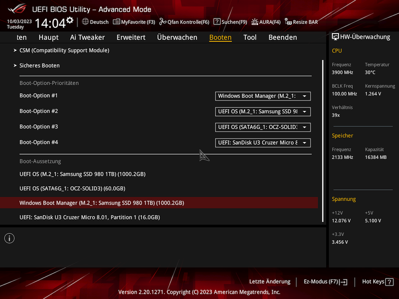 - SSD: Samsung 980 1 TB NVMe, darauf Windows 11, und auf weiterer Partition Windows 10 (momentan default), mit Bootmanager