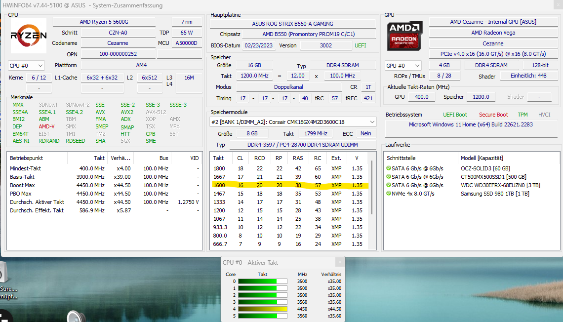 - Mainboard: Asus B550-A-Gaming mit aktuellem BIOS 3002; TPM 2.0 aktiviert; Secure Boot und Fast Boot deaktiviert