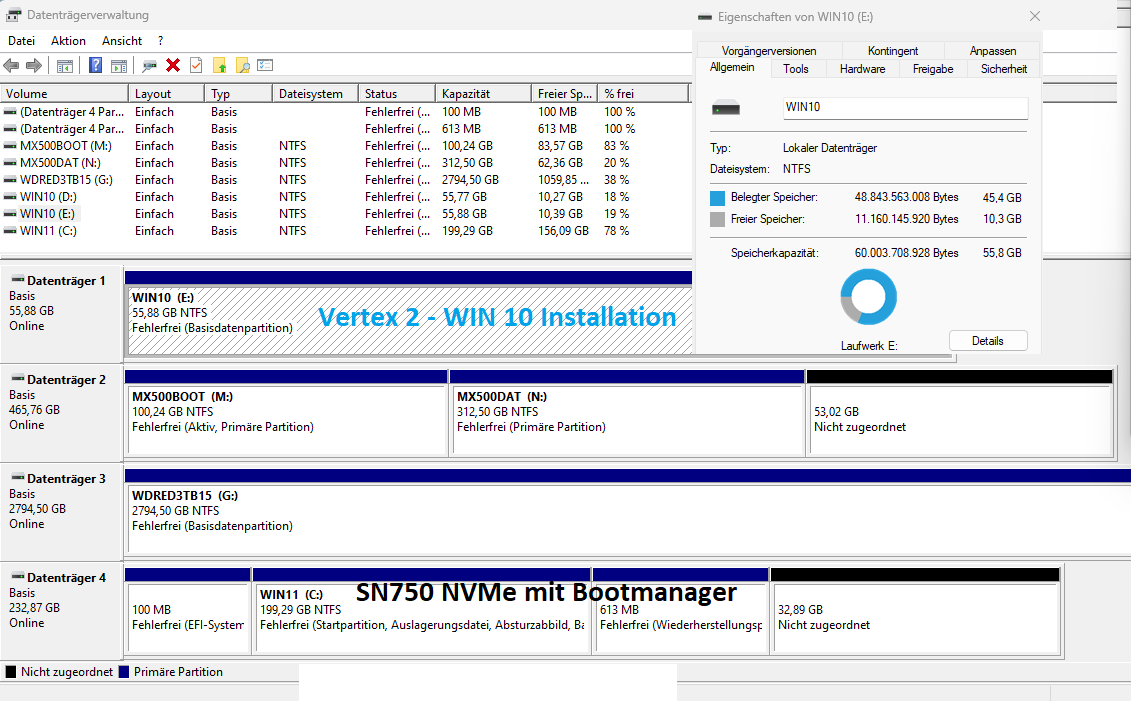 Mit der Vertex 2 kann ich Windows 10 noch starten, auch wenn beide SATA-SSDs angeschlossen sind. Laufwerke und Daten beider SSDs sind auch in beiden Betriebssystemen da.