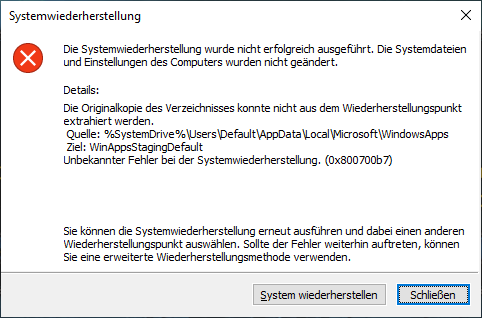 Ich finde die Fehlermeldung etwas merkwürdig. Erstens wundert es mich, dass als Benutzerprofil "Default" benutzt wird, zweitens verstehe ich nicht, wieso Windows versucht, aus dem angegebenen Pfad eine Systemwiederherstellung durchzuführen. Die Abbilder werden meines Wissens nach unter %SystemDrive%\System Volume Information angelegt.