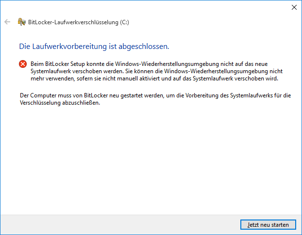 Jetzt zum Problem / der Frage: Am Ende der Einrichtung gab es jedoch eine Fehlermeldung: "Beim Bitlocker Setup konnte die Windows-Wiederherstellungsumgebung konnte nicht auf das neue Systemlaufwerk verschoben werden. Sie können die Windows-Wiederherstellungsumgebung nicht mehr verwenden, sofern sie nicht manuell aktiviert und auf das Systemlaufwerk verschoben wird."