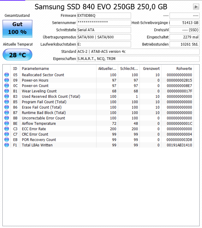 Es ist eine 840 Evo betroffen, welche bis zuletzt als System-SSD problemlos lief. Nun ist sie nicht mehr die System-Platte, seitdem die Probleme. Das Sata-Kabel habe ich schon getauscht, auch einen anderen Port am MSI X99S SLI Plus getestet. Die Smart-Werte sind auch in Ordnung, die CRC-Fehler sind bereits alt.
