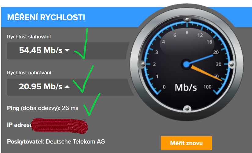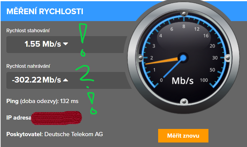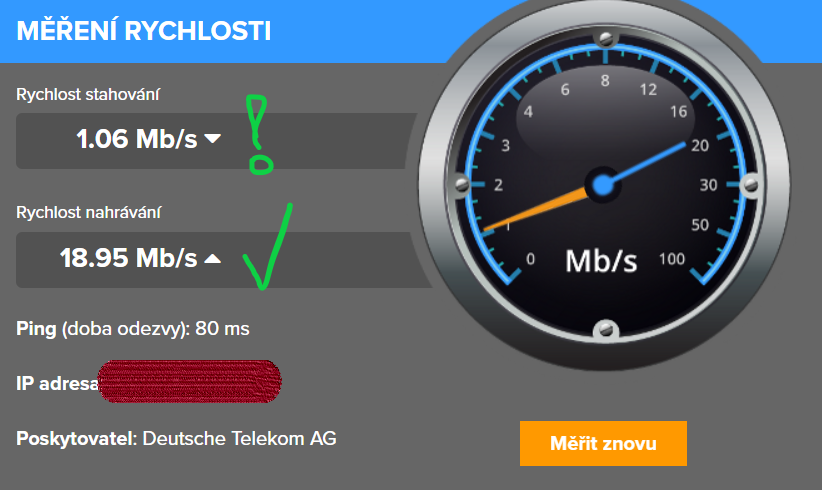 Das Problem ist wieder aufgetreten, dauert aber nur kurz und ich konnte keine genaueren Untersuchungen machen. Als ich den Router angepingt habe, war die Störung wieder weg und keine Pings sind ausgefallen. Als ich aber die Internetgeschwindigkeit gemessen habe, bekam ich überraschende Werte. Normalerweise (wenn keine Störung vorliegt), liegen meine Werte bei 50 Mb/s Download, 20 Mb/s Upload und 25 Ms Ping. Bei der Störung (wo auch wieder Pakete verloren gegangen sind) sahen die Werte ganz anders aus.