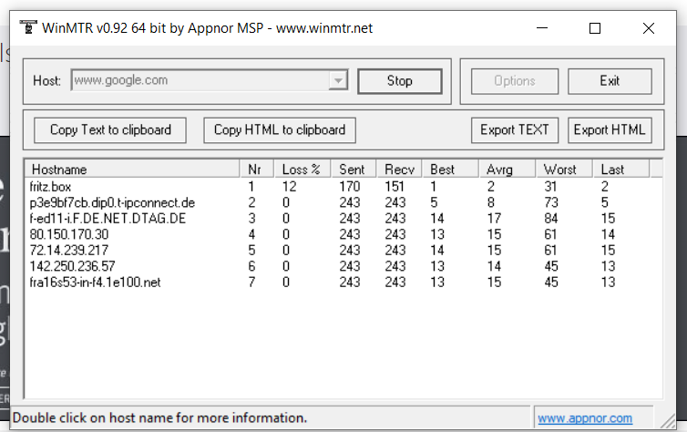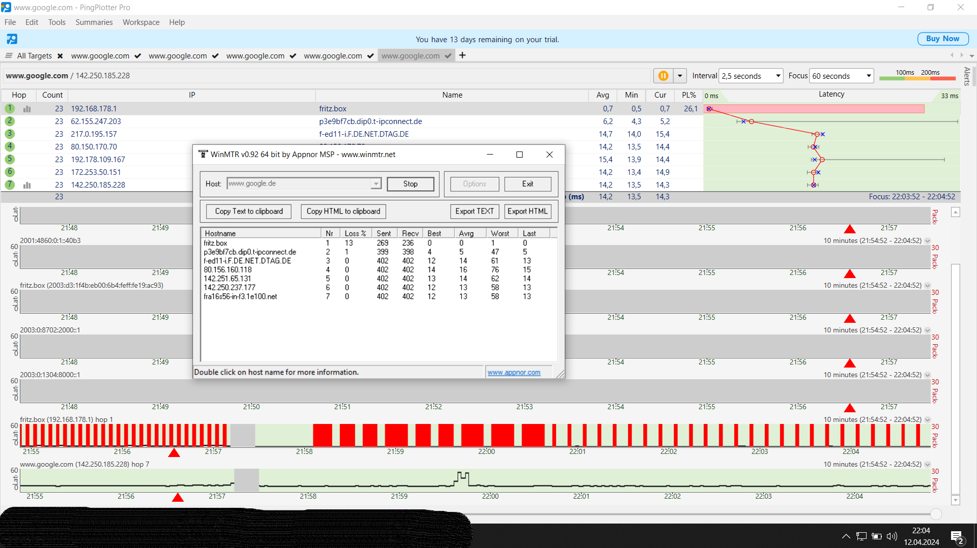 Wie dem auch sei, dein erster Screenshot macht mich stutzig. Die ersten 4 Hops haben private IP-Adressen und auch das Interface sieht verdächtig nach einer Webseite aus. Wenn dem so sein sollte, ist diese Messung unbrauchbar, weil sie die Strecke vom Webserver zu google.de misst und nicht von deinem PC aus. Abgesehen davon ist die Messung 100% in Ordnung, auch wenn Hop#8 für den ungeübten Beobachter nach einem Problem aussehen mag. Entscheidend ist immer die letzte Zeile, wenn hier alles in Ordnung ist, spielt der Rest keine Rolle.