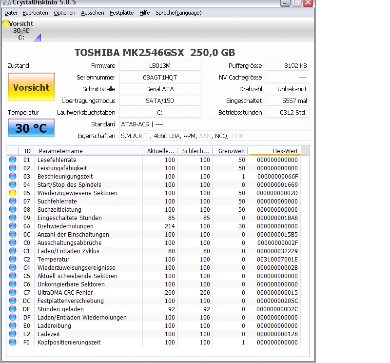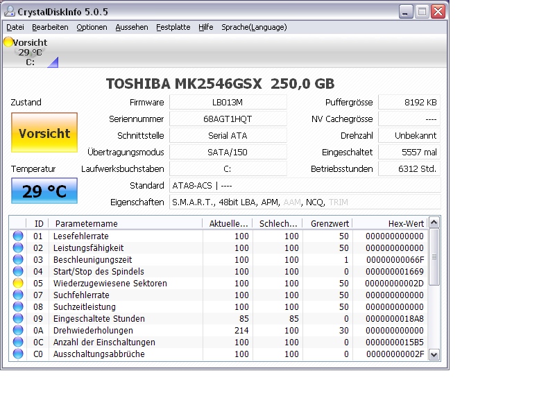 Zur Überwachung kannst du CDI automatisch mit Windows starten lassen und den Grenzwert für die wiederzugewiesenen Sektoren auf aktueller Wert+1 stellen, dann verschwindet auch das "Vorsicht".