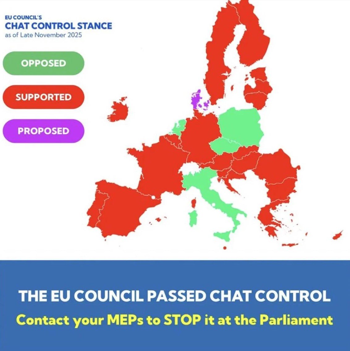 Ich dachte das Thema wäre vom Tisch und jetzt lese ich das nur 4 EU-Staaten dagegen sind (Italien, Polen, Tschechien und die Niederlanden) https://fightchatcontrol.eu/