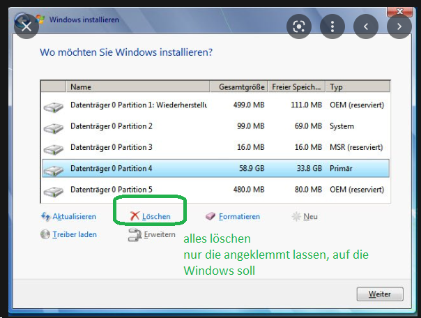 wenn man nach dem löschen der Partitonen nicht auf "Weiter" geht