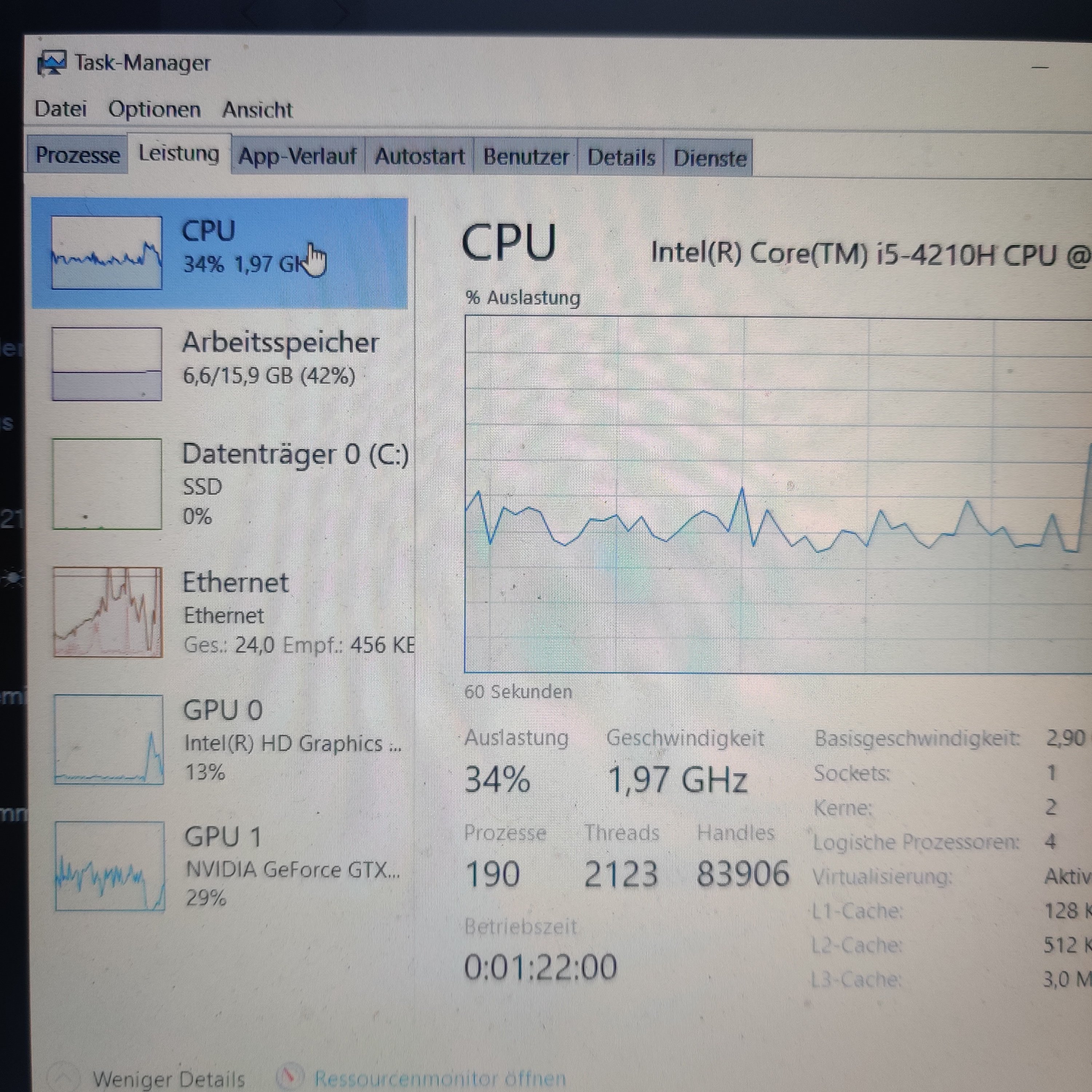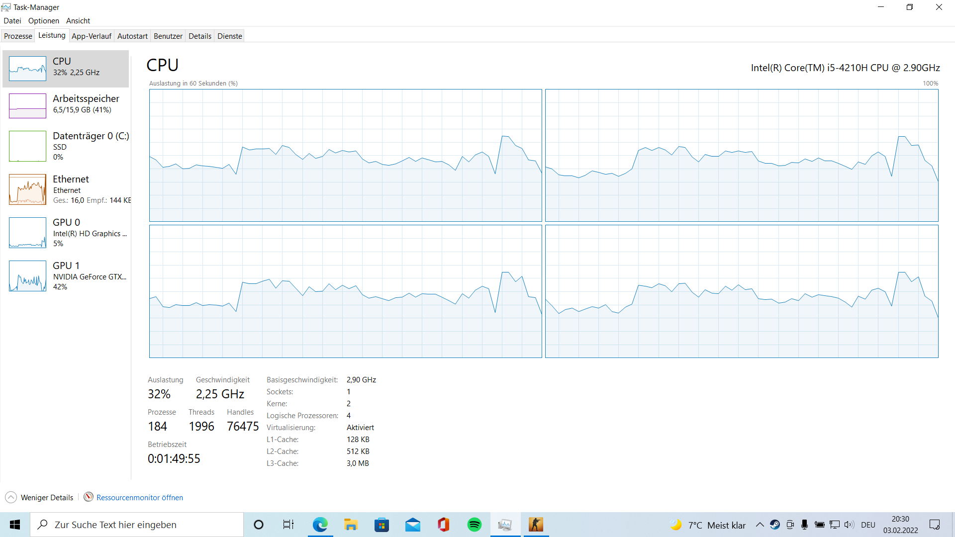 CPU: i5-4210H 2,9GHZ, Grafik: NVIDIA Geforce Gtx 950m, Ram: 16GB, 1TB SSD (Samsung SSD 870 QVO 1TB), Windows 10 vor 3 Monaten neu draufgespielt