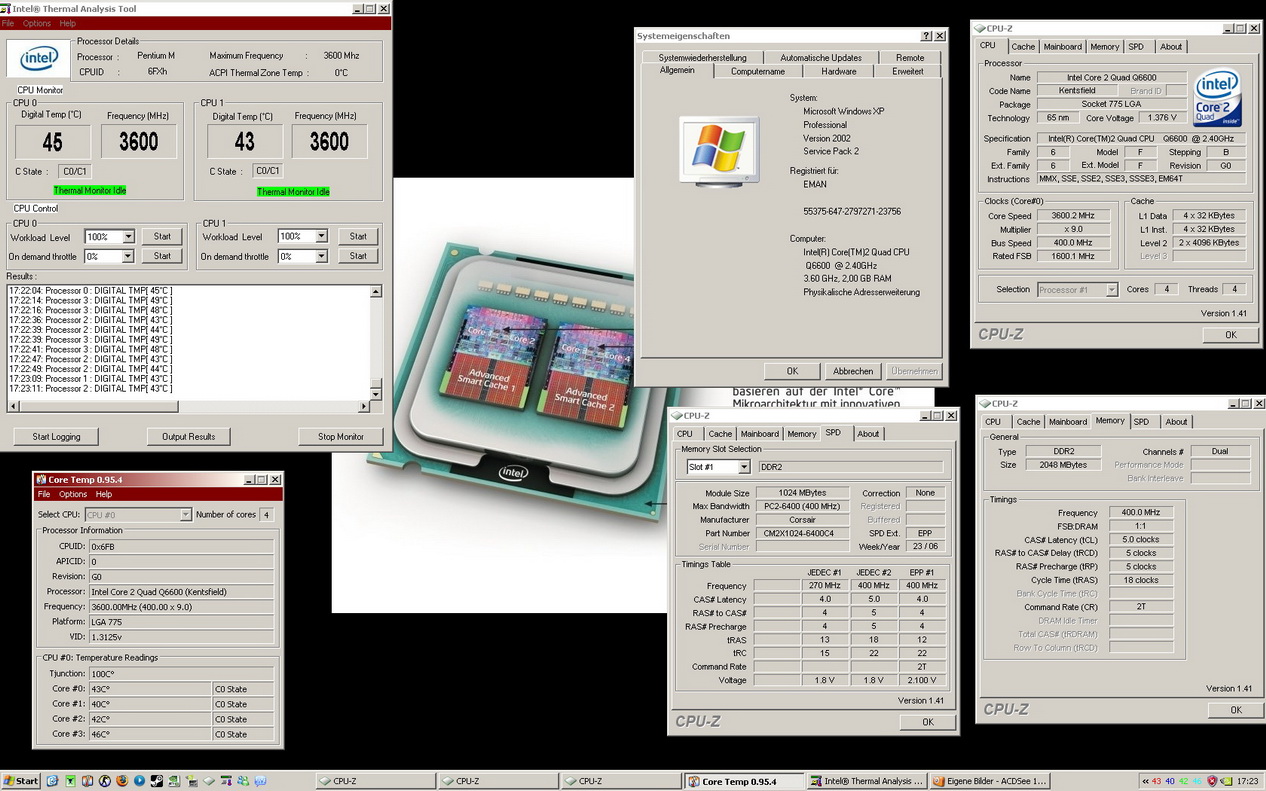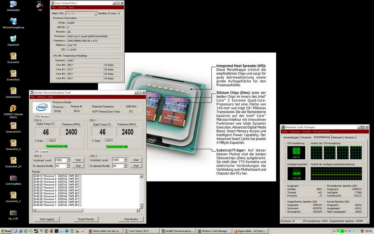 Also hau dir mal CoreTemp 0.95.4 rauf, Intel TAT, das neueste Beta Everest und dann machste Prime und dann schaun ma mal.
