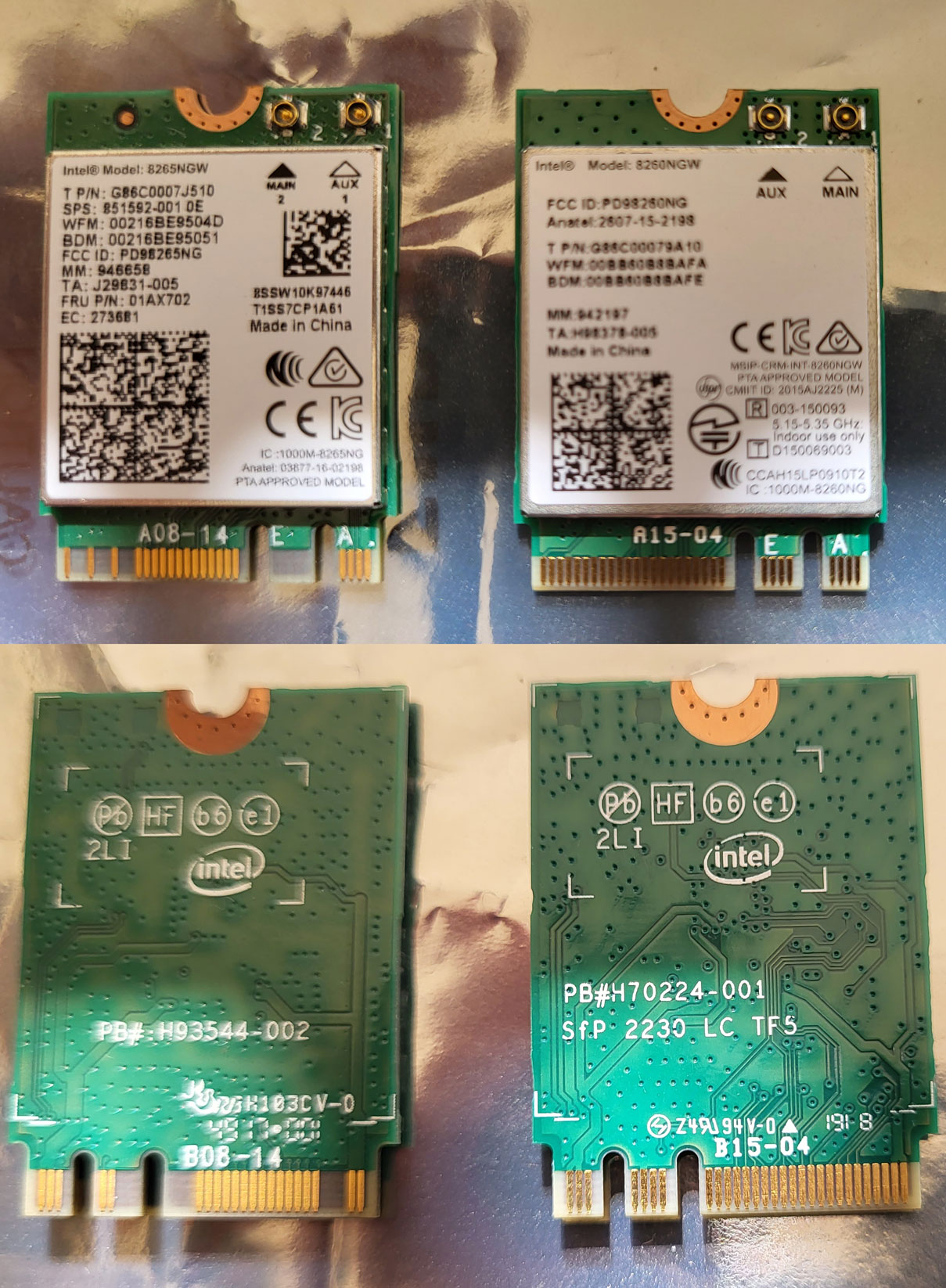 Die Karten habe ich mal im Vergleich fotografiert. Dabei ist mir aufgefallen, dass die PIN-Belegung beim AX210 Modul etwas voller ist. Auf Vorder- und Rückseite sind jeweils zwei Kontakte, die das AC7265 Modul nicht hat. Aber ein M2-Port sollte ja immer voll belegt sein, oder? Außerdem laufen beide Intel Module nach meiner Recherche über "PCIe 1.0 x1".