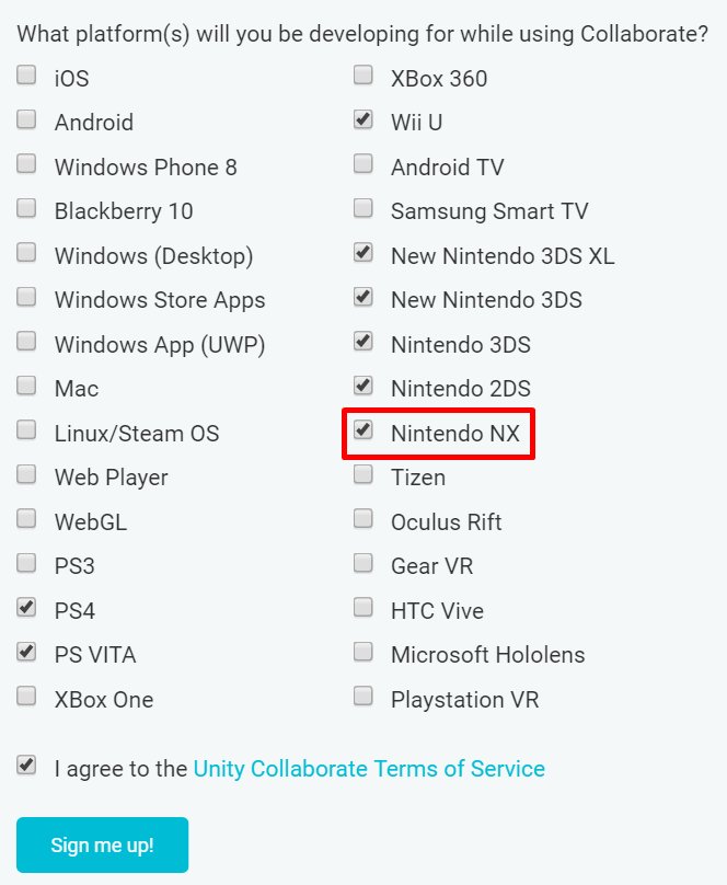 Ein neues Projekt, welches den Namen Unity Collaborate trägt, soll Entwickler nun per Cloud immer auf dem neuesten Stand ihres Unterfangens halten. Hierzu ist vor einiger Zeit eine Closed Beta ausgerufen worden, für die sich Interessierte bewerben können. Das Interessante dabei ist, dass man während der Anmeldung gefragt wird, für welche Plattformen man entwickeln möchte. In der Auswahl kann hierbei bereits Nintendos neues Konsolen-Projekt NX angewählt werden.