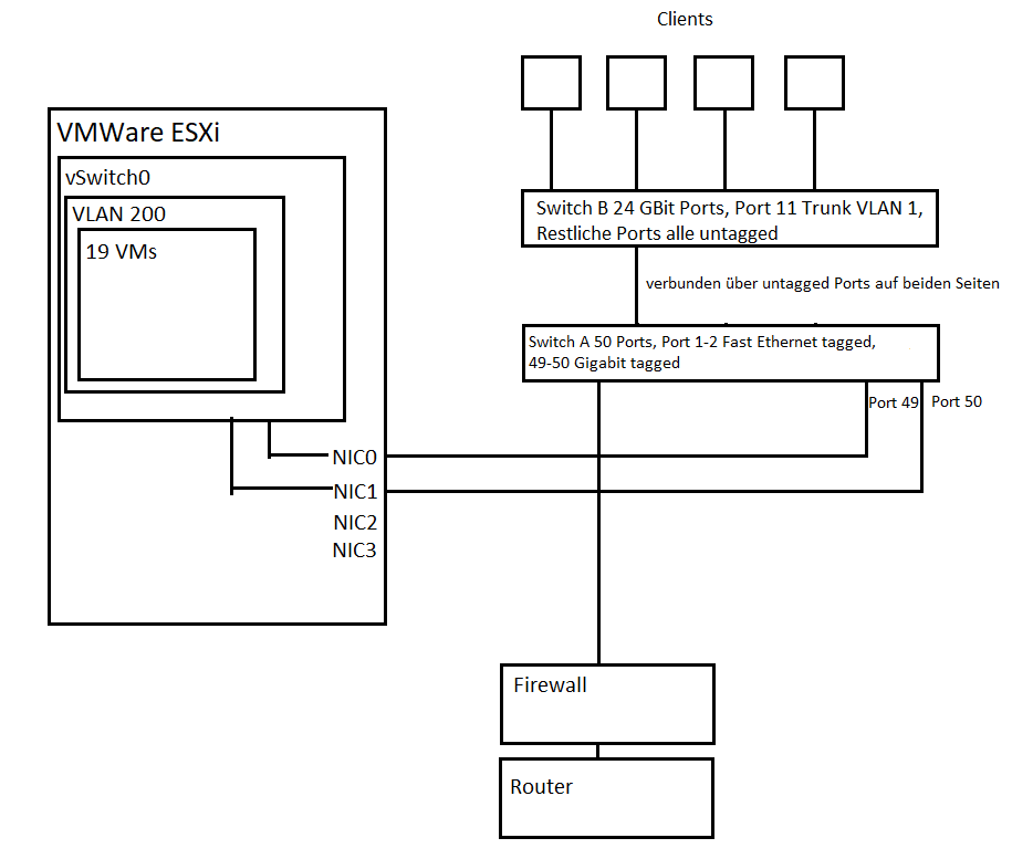 ich habe hier ein verqueres Netzwerk. Im Netzwerk befindet sich ein physikalischer Server auf dem in einem VLAN 19 virtuelle Server laufen. Der physikalische Server hat vier physikalische NICs wovon zwei dem virtuellen Switch mit jeweils 1Gb und damit dem VLAN der 19 Maschinen zugeordnet sind.