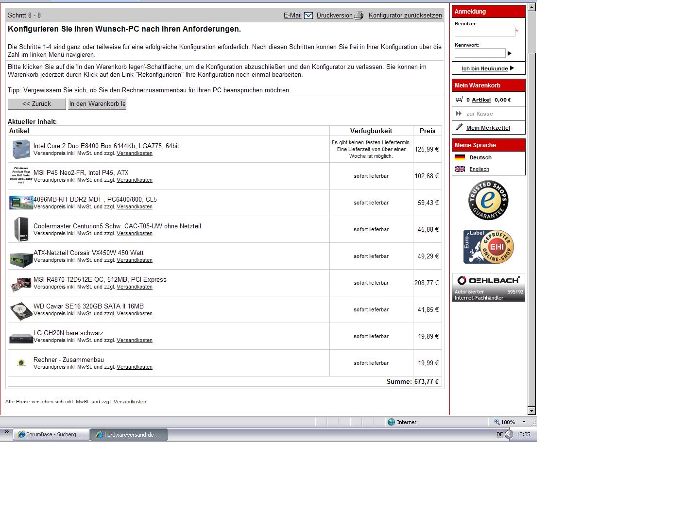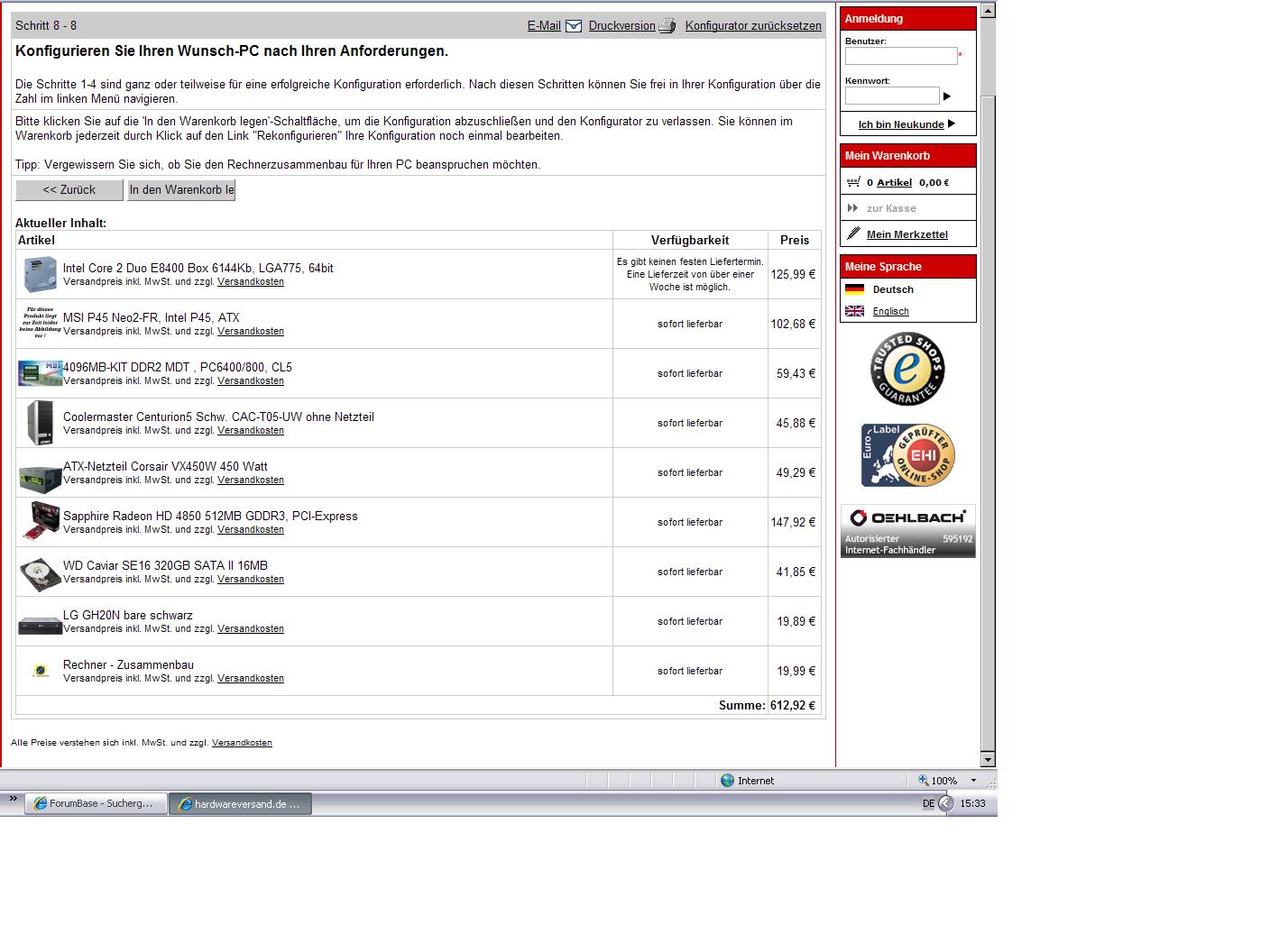 So könnte es aussehen, für 60,- € mehr, gibt es die HD4870! Wenn Du nicht übertakten willst, reicht der Boxedkühler und 800-er Speicher, ansonsten würde ich Xigmatek HDT-S1283/EKL Groß Clockner und 1000-er von G.Skill nehmen!