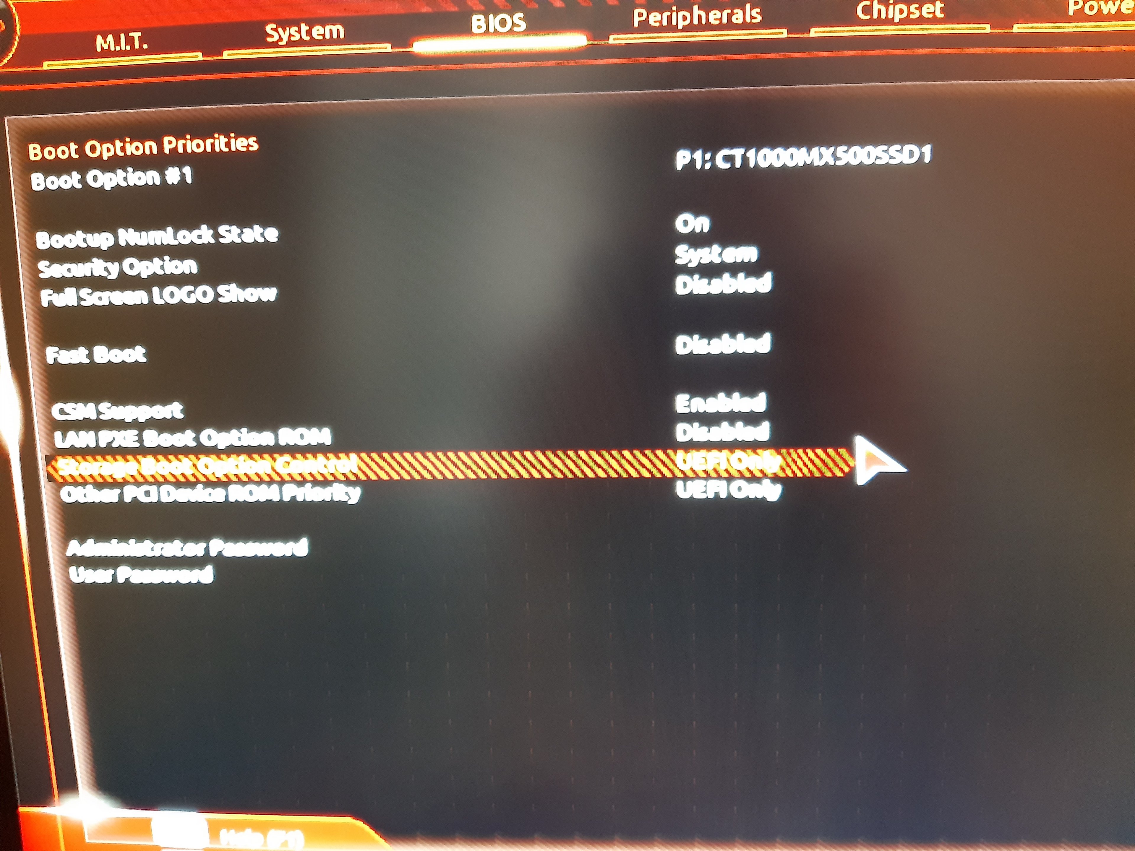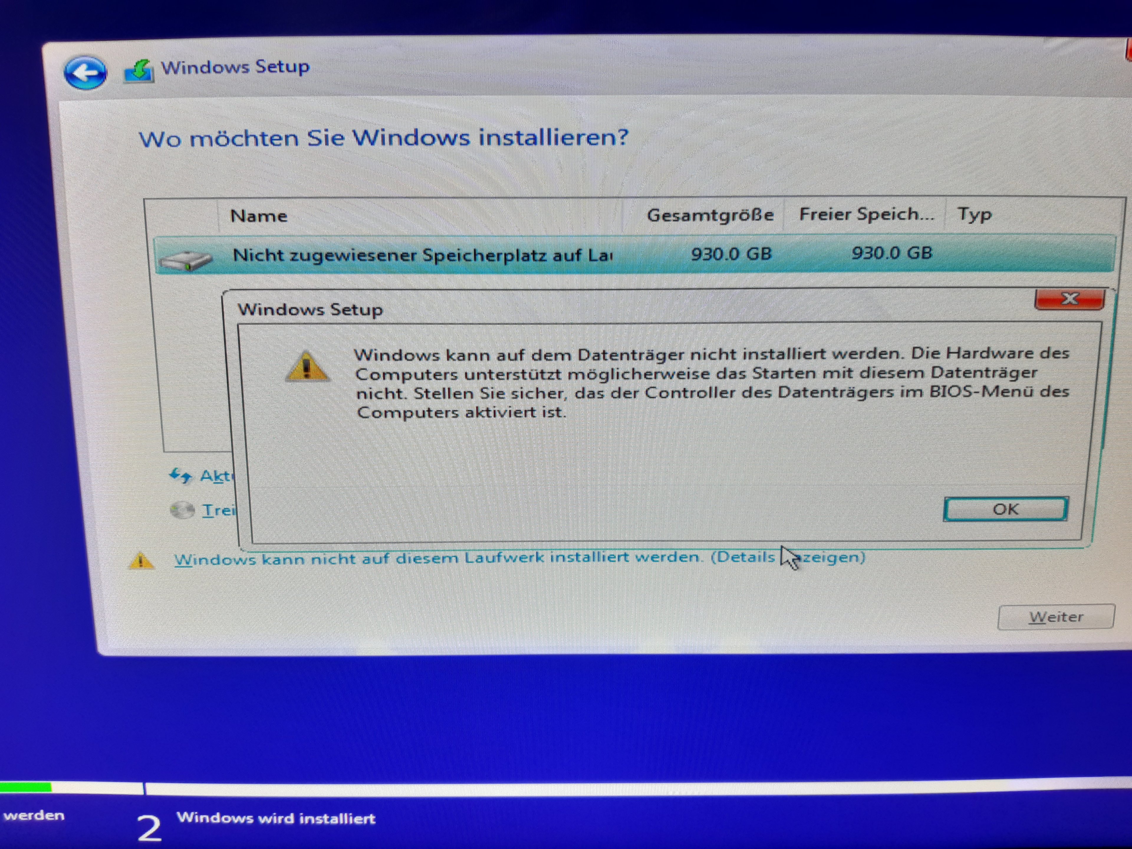 Nun habe ich das Problem, das meine 1TB Crucial MX500 zwar vom Bios erkannt wird und so( ist auch die einzige Festplatte)