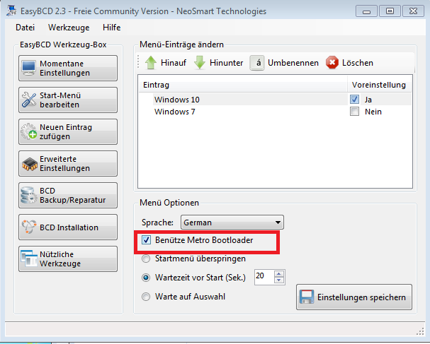 Indem in den Einstellungen das Häkchen für die Benutzung des Metro Bootmanagers aktiviert wird.