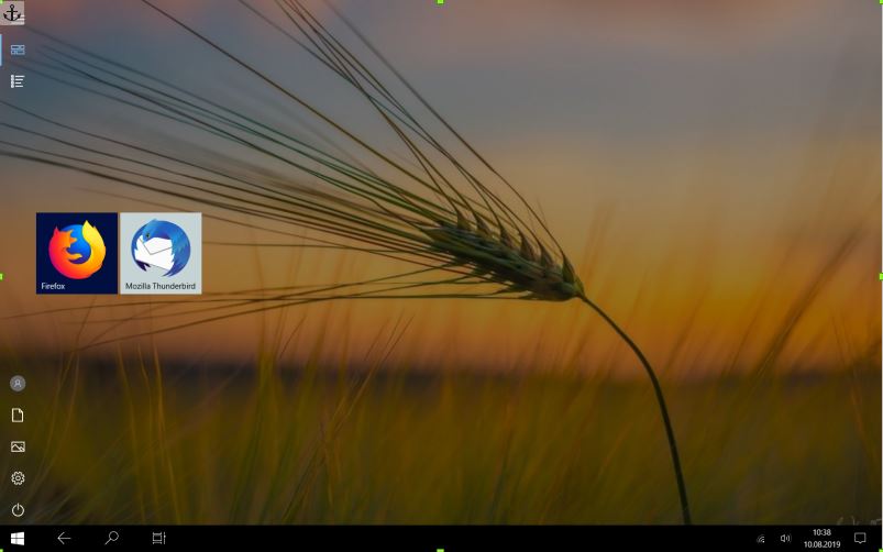Jedenfalls sieht es nun so aus (s. Anhang). Am linken Rand gibt es eine Leiste und ich kann mir alle Apps auf dem Desktop anzeigen lassen wenn ich oben links auf die Symbole klicke. Unten in der Taskleiste gibt es einen großen Pfeil der nach links zeigt, die Programmverknüpfungen in der Leiste sind futsch.