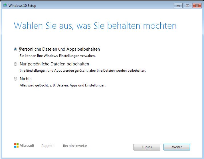 Ich habe schon die erste Variante der Installation versucht ("Persönliche Datein und Apps behalten"). Das hat jedoch dazu geführt, dass Win 7 einfach auf Win 10 geupdatet wurde.