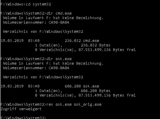 Die Methode "utilman" bzw "osk" funktioniert leider nicht da das System gelockt ist, vermutlich wegen