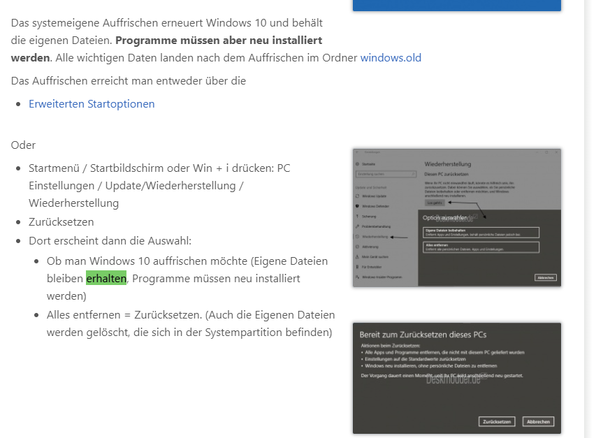 Laut Deskmodder bleiben Dateien erhalten nur Programme müssen neu installiert werden.