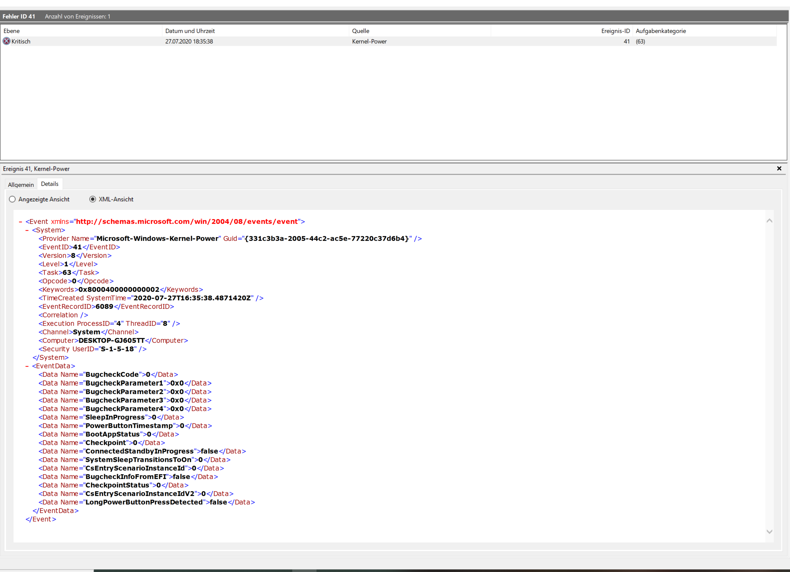 In der Ereignisanzeige steht dann: Ereignis ID 41 (Datei im Anhang)